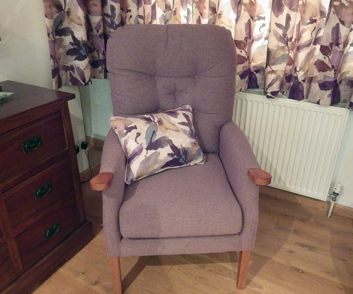 The pelmets and curtains are made from a Prestigious material, Design Azzuro. To look at it you would think it's a cotton/ linen material, but it has a brushed cotton feel to it. The chairs are upholstered . Design Harrison , colour Thistle. The whole job was a delight to do, I enjoy making pelmets and together I really think that they complement each other.